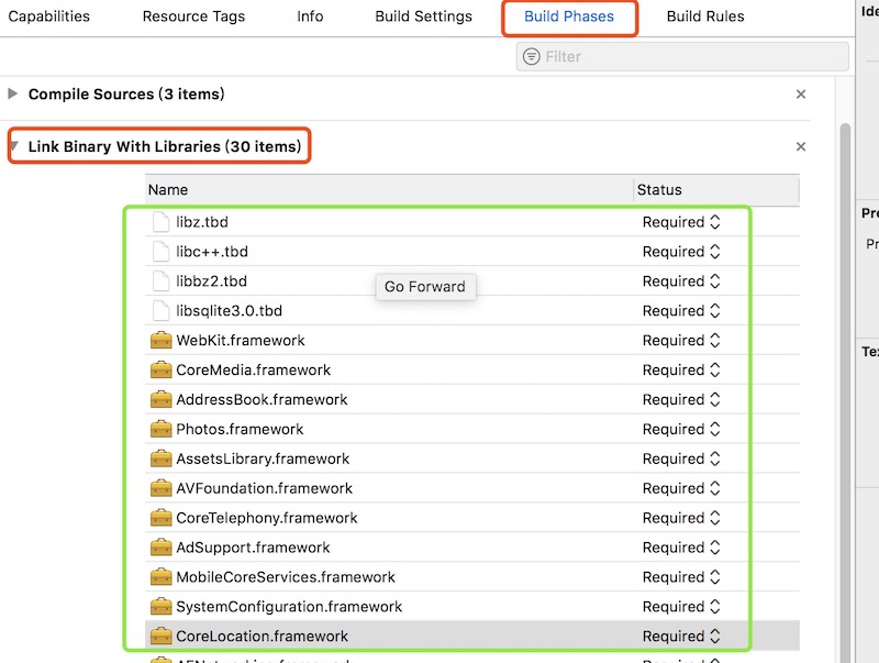 添加SDK需要的系統庫,Xcode —> Build Phases —> Link Binary With Libraries 中,添加下圖中的庫